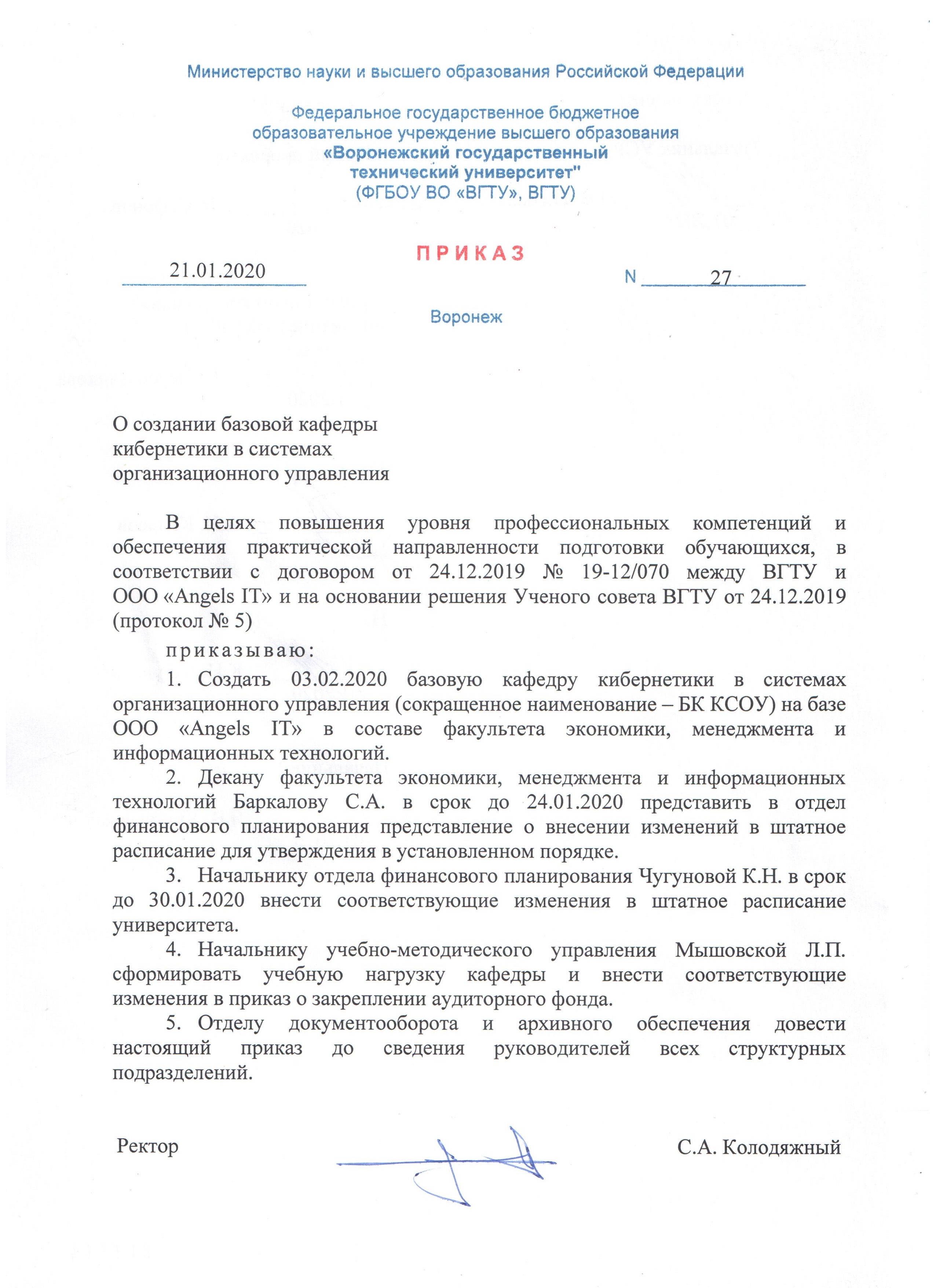 Базовая кафедра “Кибернетики в системах организационного управления” создана приказом ректора ВГТУ № 27 от 21 января 2020 г. на основании договора с ООО "Angels IT" № 19-12/070 от 24 декабря 2019 г.