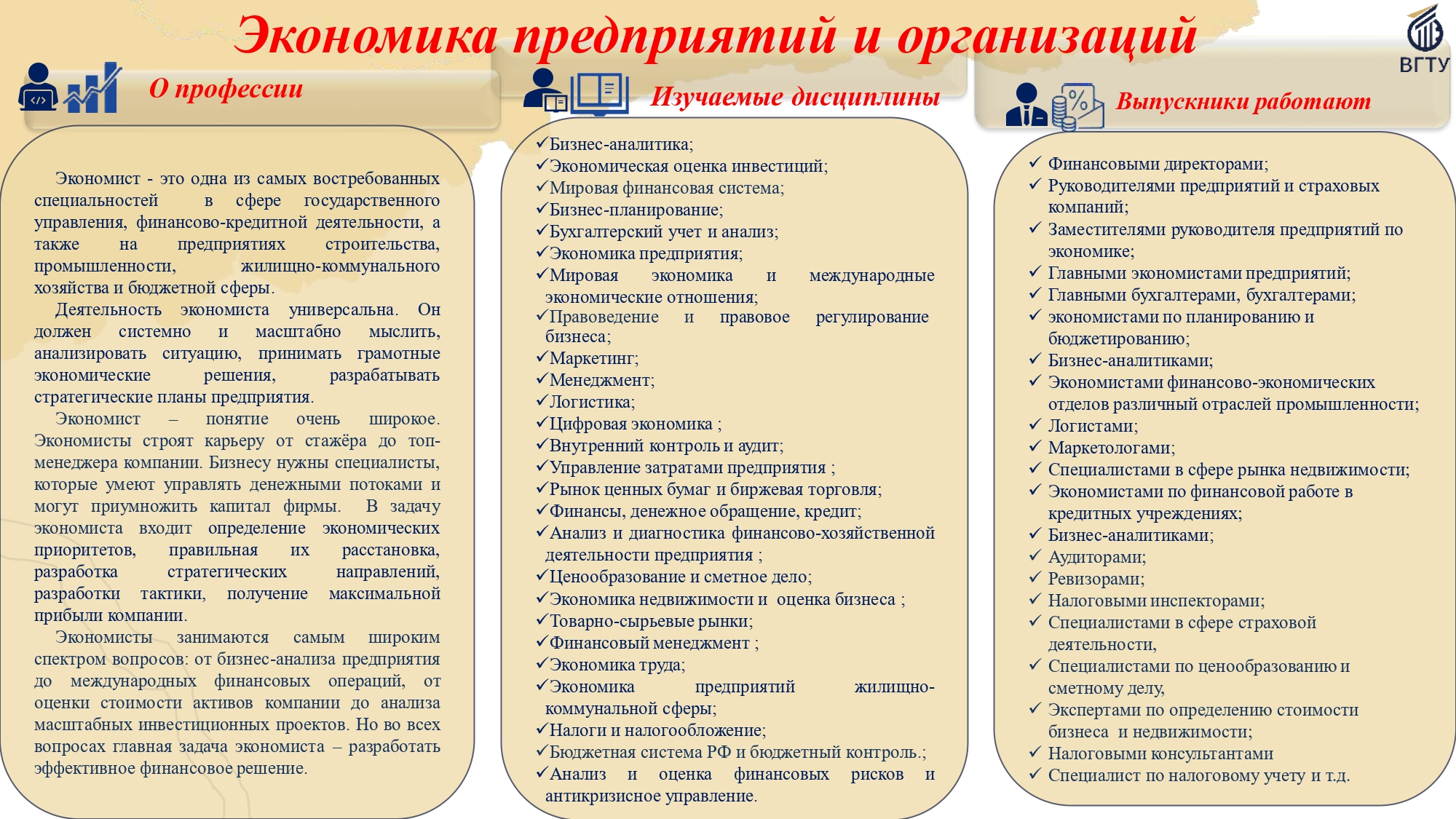 Кафедра объединяет профессоров и преподавателей в области цифровой, отраслевой и корпоративной экономики, бухгалтерского учета, финансов, практической психологии, юриспруденции и бизнес-информатики.