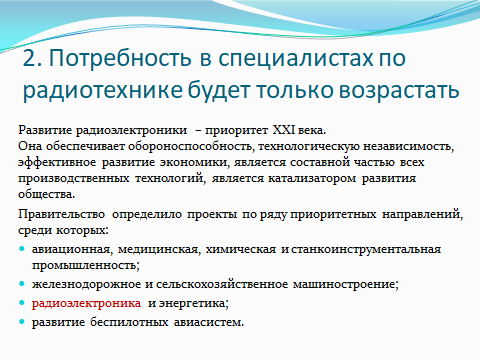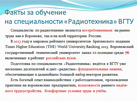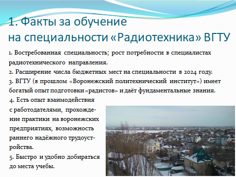 Направление подготовки 11.03.01 “Радиотехника” профиль “Радиотехнические средства передачи, приема и обработки сигналов” в полной мере отвечает самым современным требованиям к подготовке специалистов для радиотехнической отрасли Российской Федерации. Одним из крупным центров радиотехнической отрасли является г. Воронеж, представляющий собой крупнейший кластер радиоэлектронного производства.