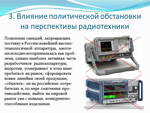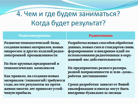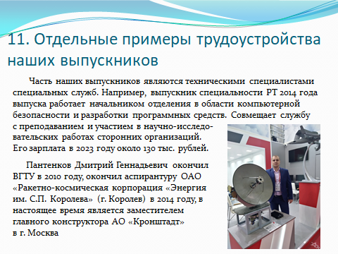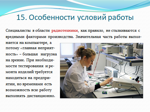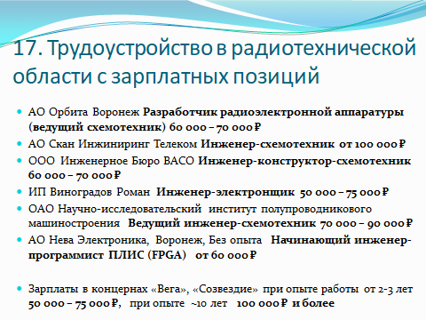 Создают эту радиоэлектронную технику большое количество инженеров различных специальностей, но инженерам по направлению «Радиотехника» отводится во всем этом особая роль. Они при создании новых радиоэлектронных изделий занимают лидирующие позиции, разрабатывая принцип работы нового устройства, его структуру, схемы соединения его элементов. И только после сборки и испытаний собранного ими макета или компьютерной модели привлекают специалистов в области микроэлектроники, новых материалов, технологии и конструкций для получения окончательного вида радиоэлектронного изделия, обеспечивая дальнейший его контроль и проведение испытаний. Именно профессиональных специалистов, соответствующих этим высоким требованиям и готовит направление 11.03.01 «Радиотехника». Наши выпускники всегда пользуются большим спросом на рынке труда и после окончания вуза трудоустраиваются на престижную и хорошо оплачиваемую работу.