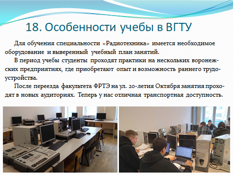 Изучение студентами далее специальных дисциплин (радиопередающие устройства, радиоприемные устройства, усилители, источники питания, микропроцессорные устройства, антенны, защита информации в каналах связи и другие) обеспечивают им необходимые знания для успешной разработки различных устройств и приборов радиотехнического назначения. Проведение в процессе учебы на базовом центре факультета радиотехники и электроники в АО “Концерн “Созвездие” исследований на новейшем радиотехническом оборудовании позволяет студентам повысить свой профессиональный уровень. Для студентов читаются лекции ведущими учеными ОАО «Концерн «Созвездие»: доктором технических наук, лауреатом Государственно премии СССР Малышевым Иваном Иосифовичем и доктором технических наук, главным научным сотрудником АО «ВНИИ «Вега» Поветко Василием Николаевичем. Студентам на предприятиях выделены специализированные аудитории для проведения лекций, практических занятий, ознакомления с инструкциями уникальных приборов для проведения исследований, а также лаборатории с уникальным и дорогостоящим оборудованием. На этой базе студенты проводят лабораторные работы, а также осуществляют исследования в рамках научно производственной и преддипломной практик и дипломного проектирования.