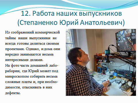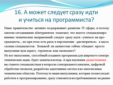 Универсальность специальности в сочетании с глубоким знанием современных информационных технологий и практическими навыками в области вычислительной техники обеспечивает выпускникам – радистам надежное профессиональное будущее.