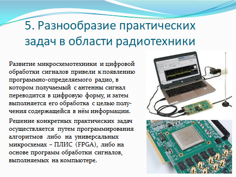 Современное общество, в котором Вам предстоит жить и работать становится Глобальным Информационным Обществом. Передачей, приемом и обработкой информации охвачены все виды деятельности современного жителя планеты Земля, независимо от конкретной его профессии. Всё вокруг нас наполнено изделиями радиотехники и электроники. У каждого из нас есть сотовый телефон, телевизор, компьютер, планшетник, видеорегистратор и т.д. и мы пользуемся Интернетом, спутниковыми телевизионными антеннами, переходим к беспроводной связи Wi-Fi и Bluetooth как в быту, так и на производстве. Применение изделий радиотехники и электроники в военных целях еще больше расширено. Обороноспособность страны не мыслима без современного радиоэлектронного оборудования в самолетах, ракетах, снарядах, спутниках, танках, GPS-инерциальных системах наведения крылатых ракет, высокоточных радиолокационных станциях, лазерных системах различного назначения и т.д.