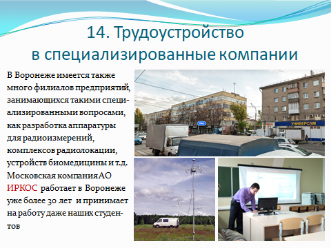 Студенты, обучающиеся на кафедре радиотехники готовятся для работы на предприятиях: ОАО “Концерн “Созвездие”, ОАО “Электросигнал”, АО “ВЦКБ “Полюс”, АО “ВЕГА”, АО “НИИЭТ”, АО “ИРКОС”, ООО “БК “Автоматика”, ОАО “НКТБ Феррит”, ООО “АЕДООН”, АО “НВП “ПРОТЕК”, ОАО “Корпорация НПО “РИФ”, ООО “Эй-Ти Консалтинг”, ФСБ, МВД РФ, ФСО и др.