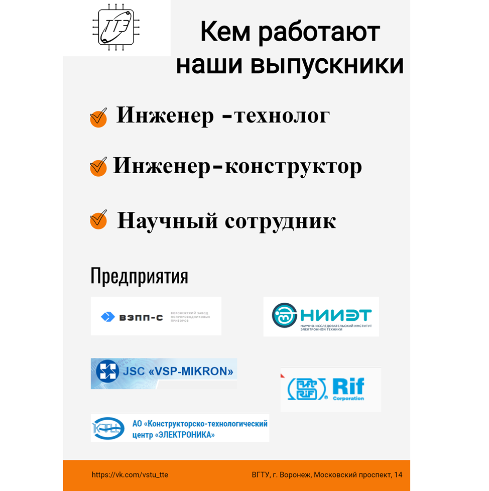 Каждое из этих предприятий нуждается в притоке новых высокообразованных специалистов. Кафедра твердотельной электроники имеет многолетний опыт (более 65 лет) подготовки кадров по данному направлению. Для практико-ориентированной подготовки студентов все дисциплины в полной мере обеспечены материально-технической базой, которая включает научно-исследовательское оборудование лабораторий кафедры твердотельной электроники, лаборатории и технологическое оборудование предприятий «ВЗПП-Микрон», «ВЗПП-Сборка» и ООО «НИИЭТ», с которыми заключены договоры о сотрудничестве.