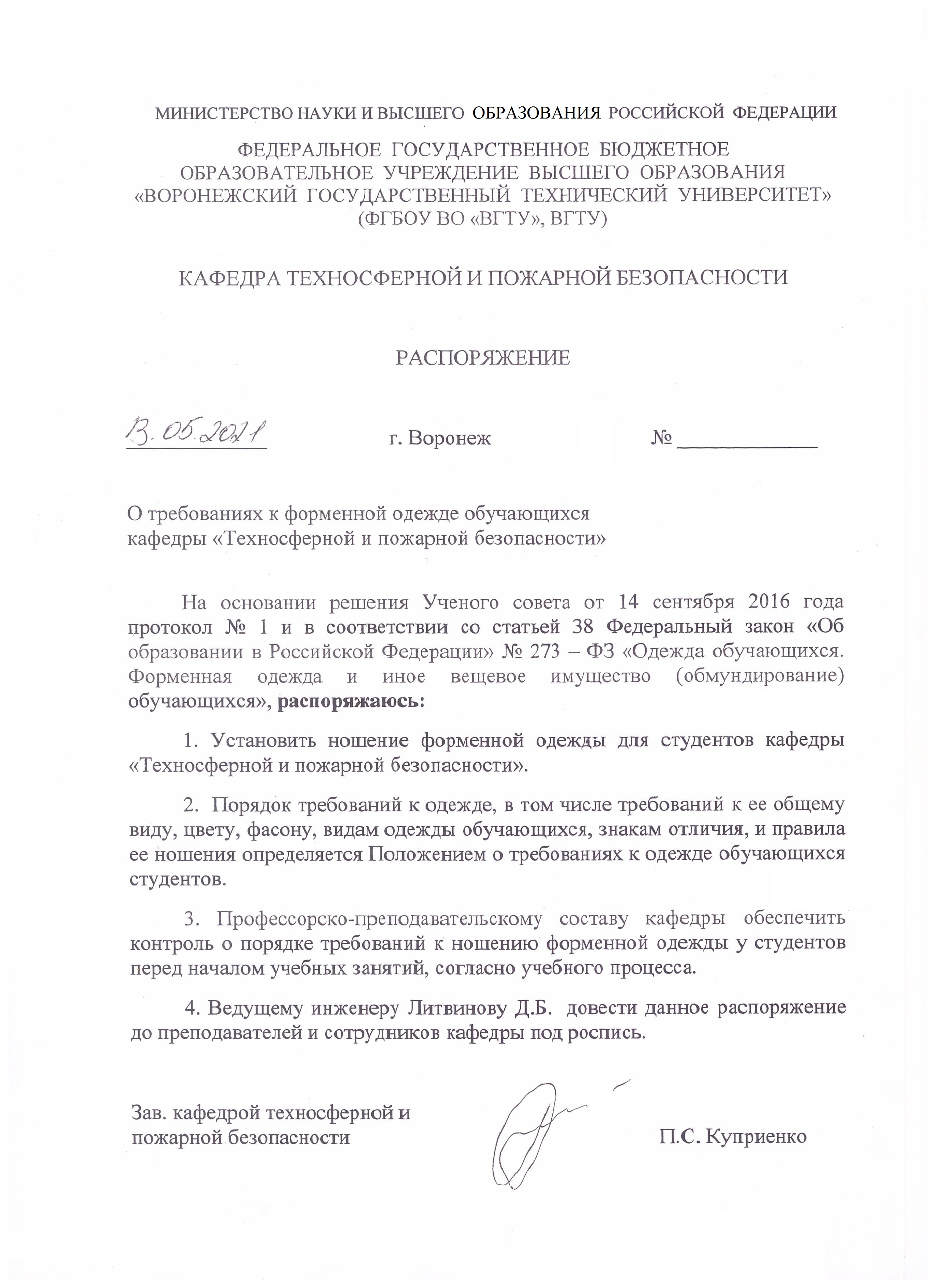 На основании приказа ректора ВГТУ от 03.03.2001 года № 33-01.15-3 на базе кафедры создана Воронежская региональная общественная организация «Студенческий спасательный отряд». По результатам обучения территориальной аттестационной комиссией членам отряда присваивается квалификация – «Спасатель».
