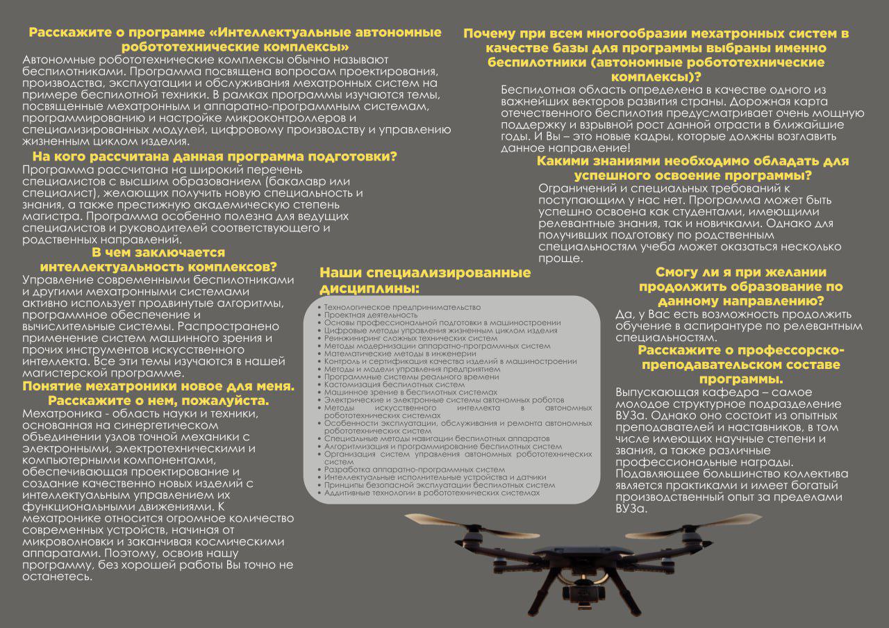 Область профессиональной деятельности выпускников включает научные исследования, опытно-конструкторские разработки, технологическую подготовку производства и педагогическую деятельность в сфере создания и применения интеллектуальных автономных робототехнических комплексов.