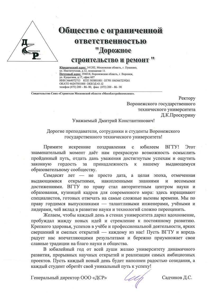Поздравление генерального директора ООО ДСР Д.С. Садчикова