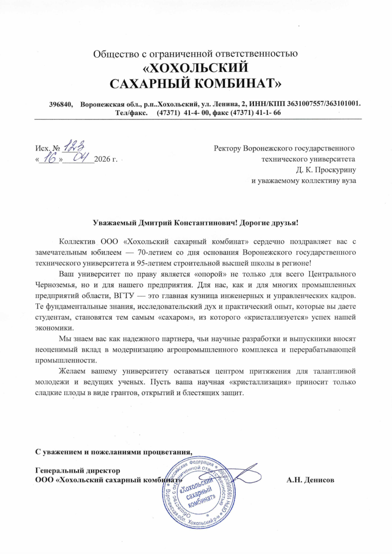 Поздравление генерального директора ООО Хохольский сахарный комбинат А.Н. Денисова