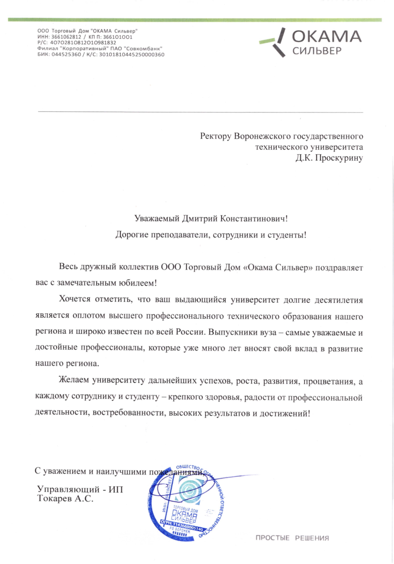Поздравление директора ООО ТД Окама Сильвер А.С. Токарева