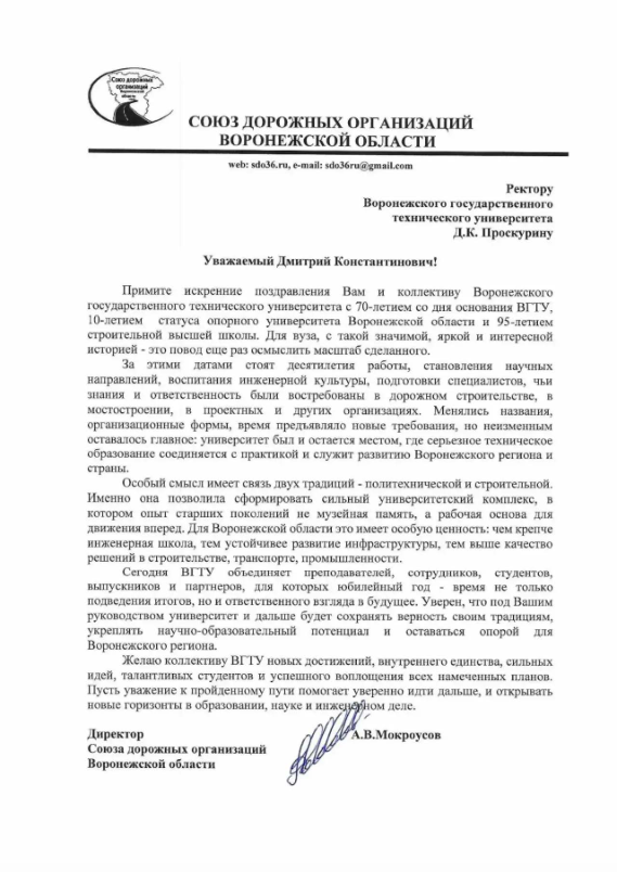 Поздравление директора Союза дорожных организаций ВО А.В. Мокроусова