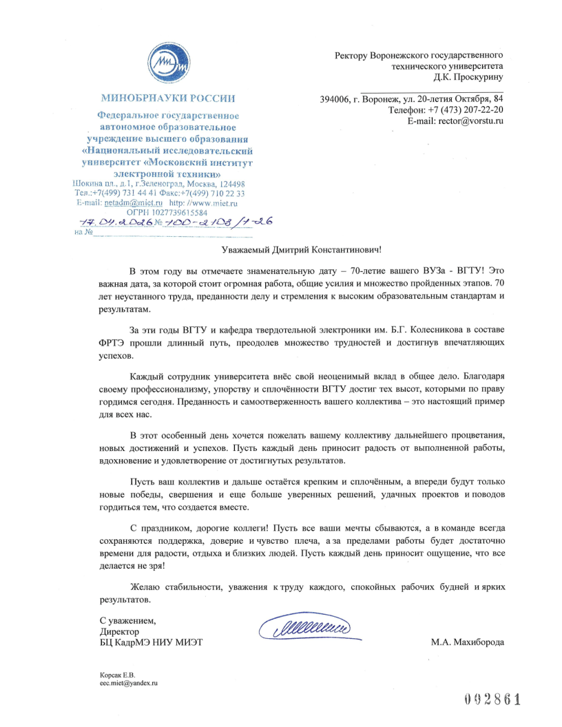 Поздравление директора НИУ Московского института электроной техники М.А. Махиборода