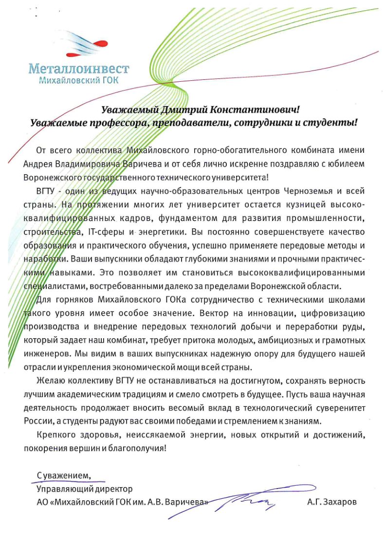 Поздравление директора ОА Михайловский ГОК им. А.В. Варичева А.Г. Захарова