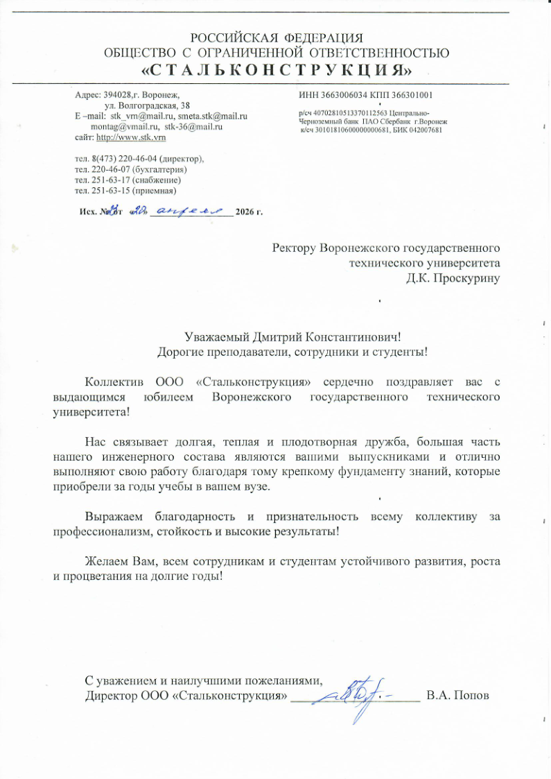 Поздравление директора ООО "Стальконструкция" В.А. Попова