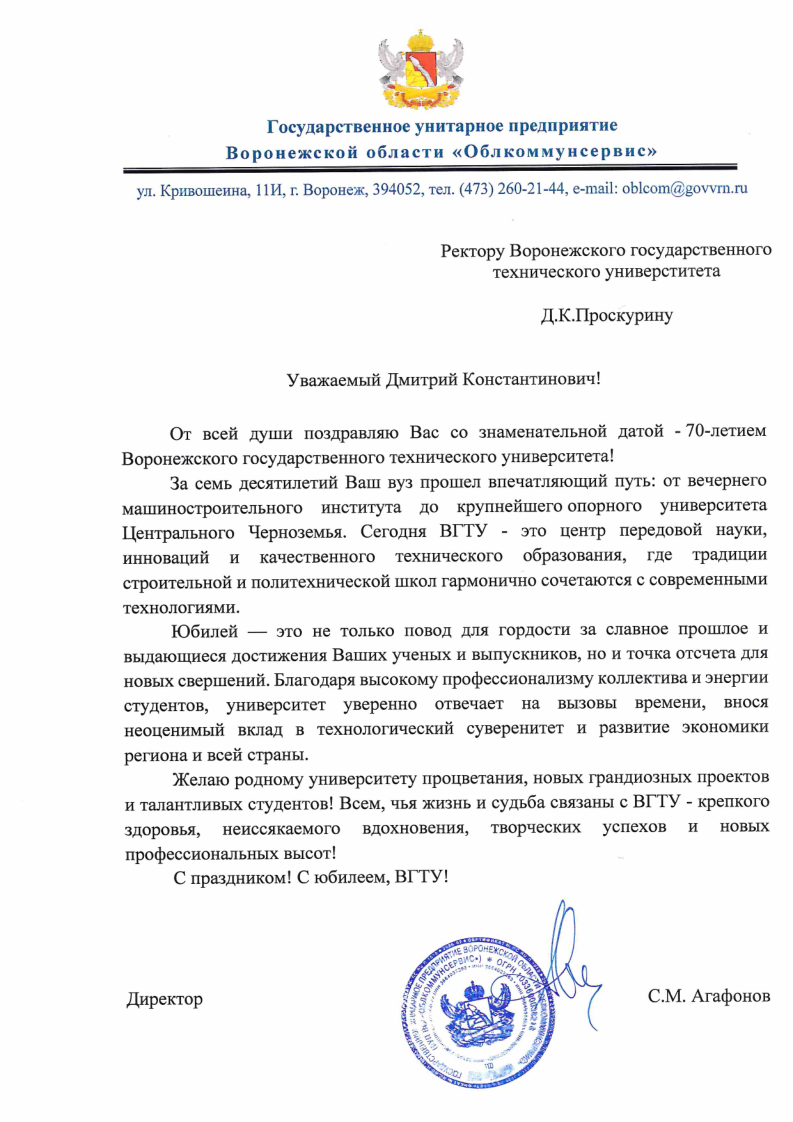 Поздравление директора Облкоммунсервис С.М. Агафонова