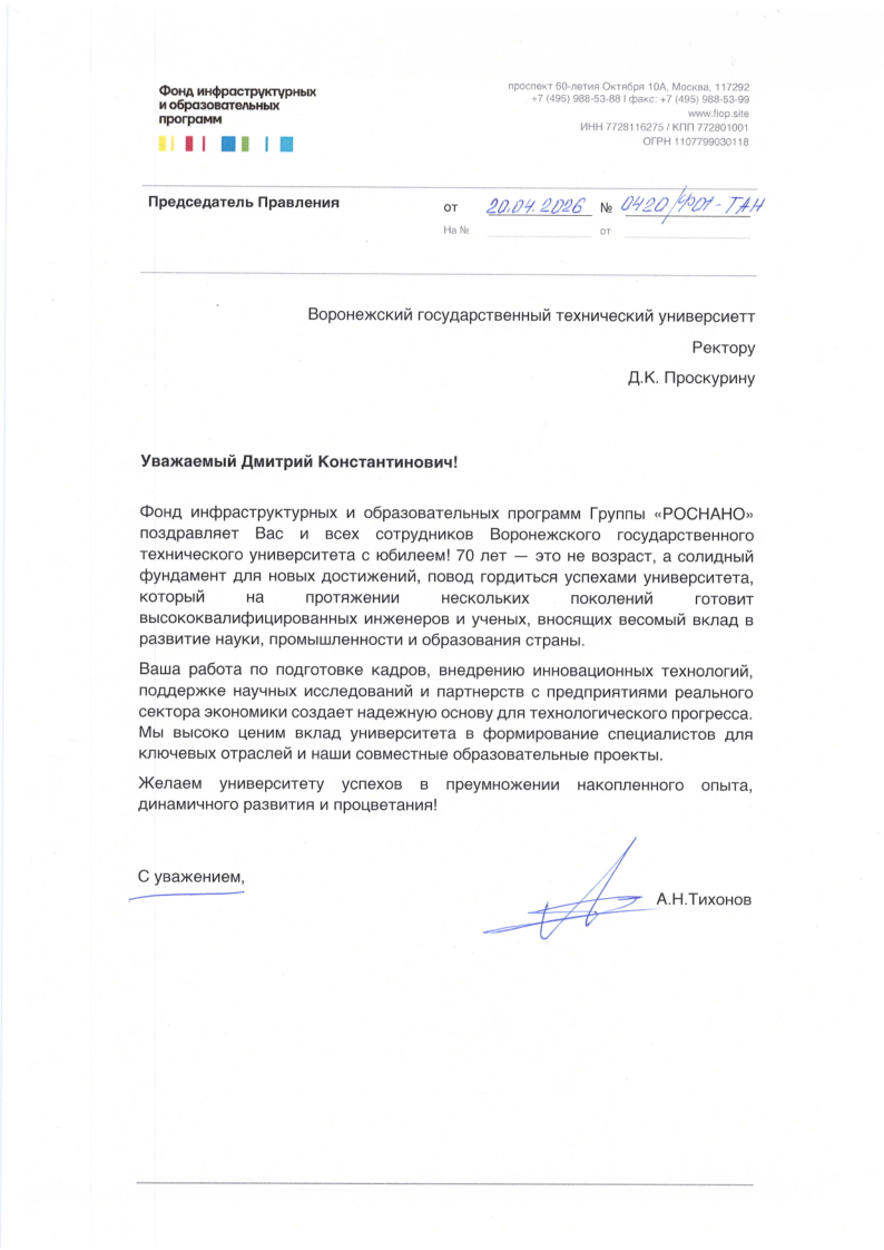 Поздравление председателя правления фонда инфраструктурных и образовательных программ А.Н. Тихонова