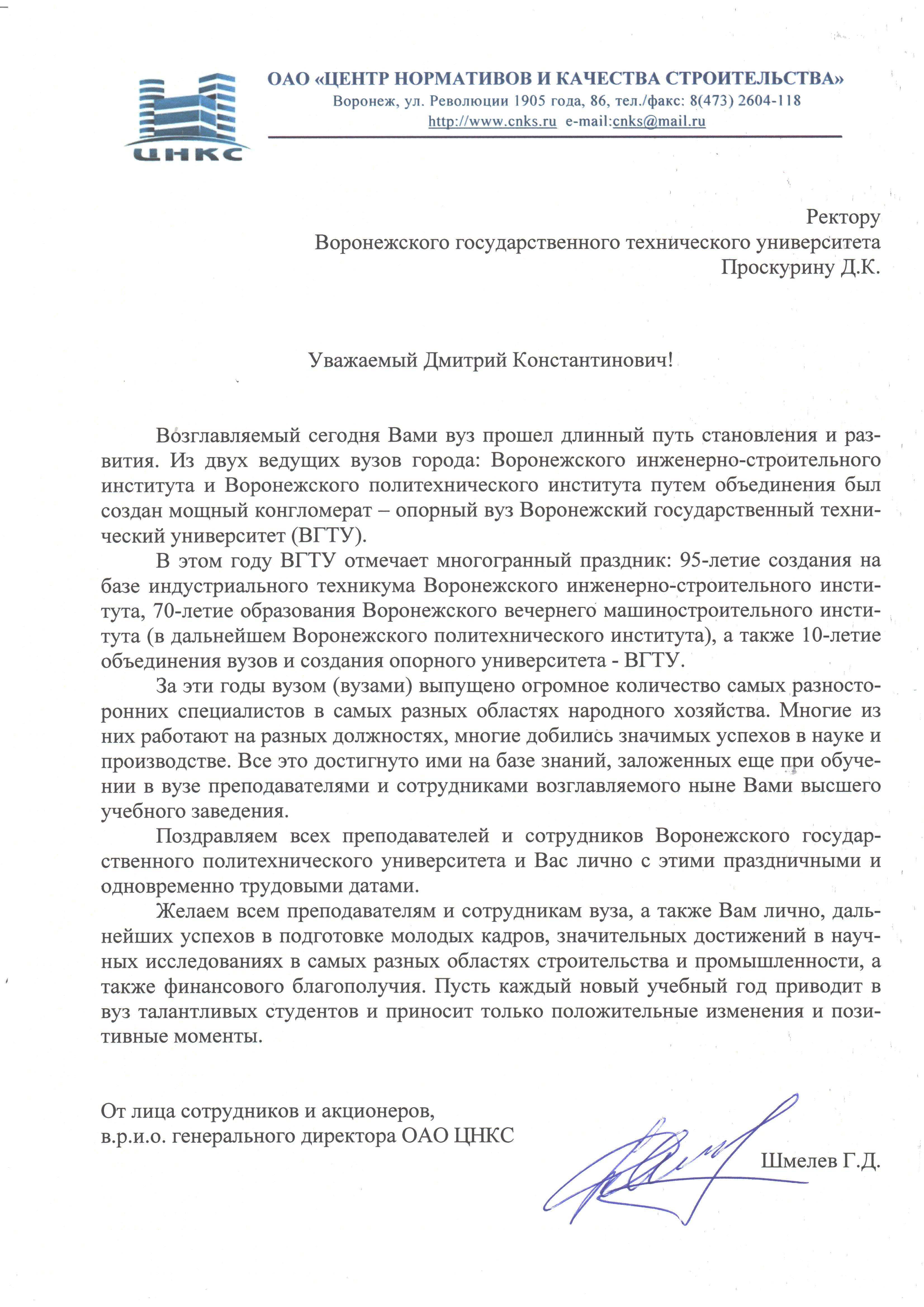 Поздравление врио генерального директора ОАО ЦНКС Г.Д. Шмелева