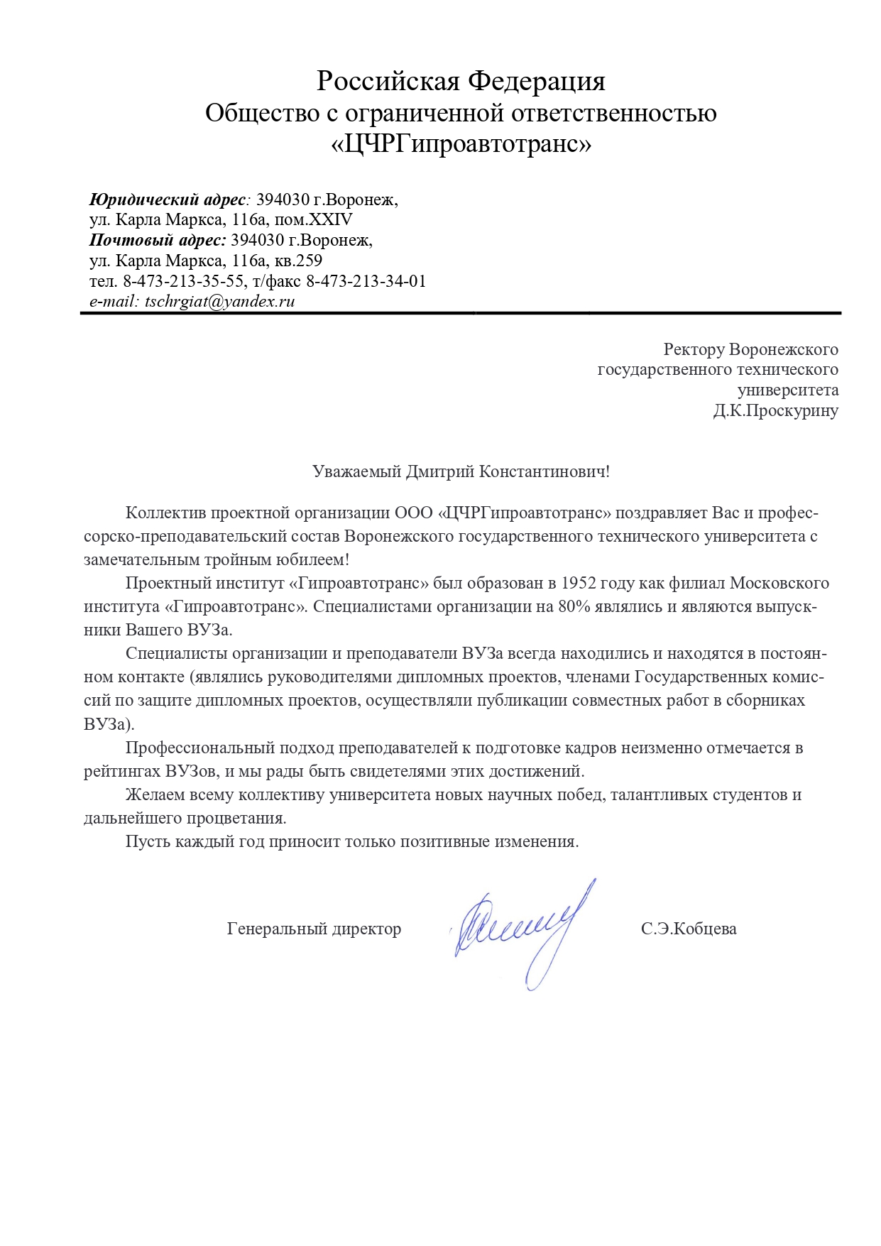 поздравление генерального директора ООО ЦЧРГипроавтотранса С.Э. Кобцевой