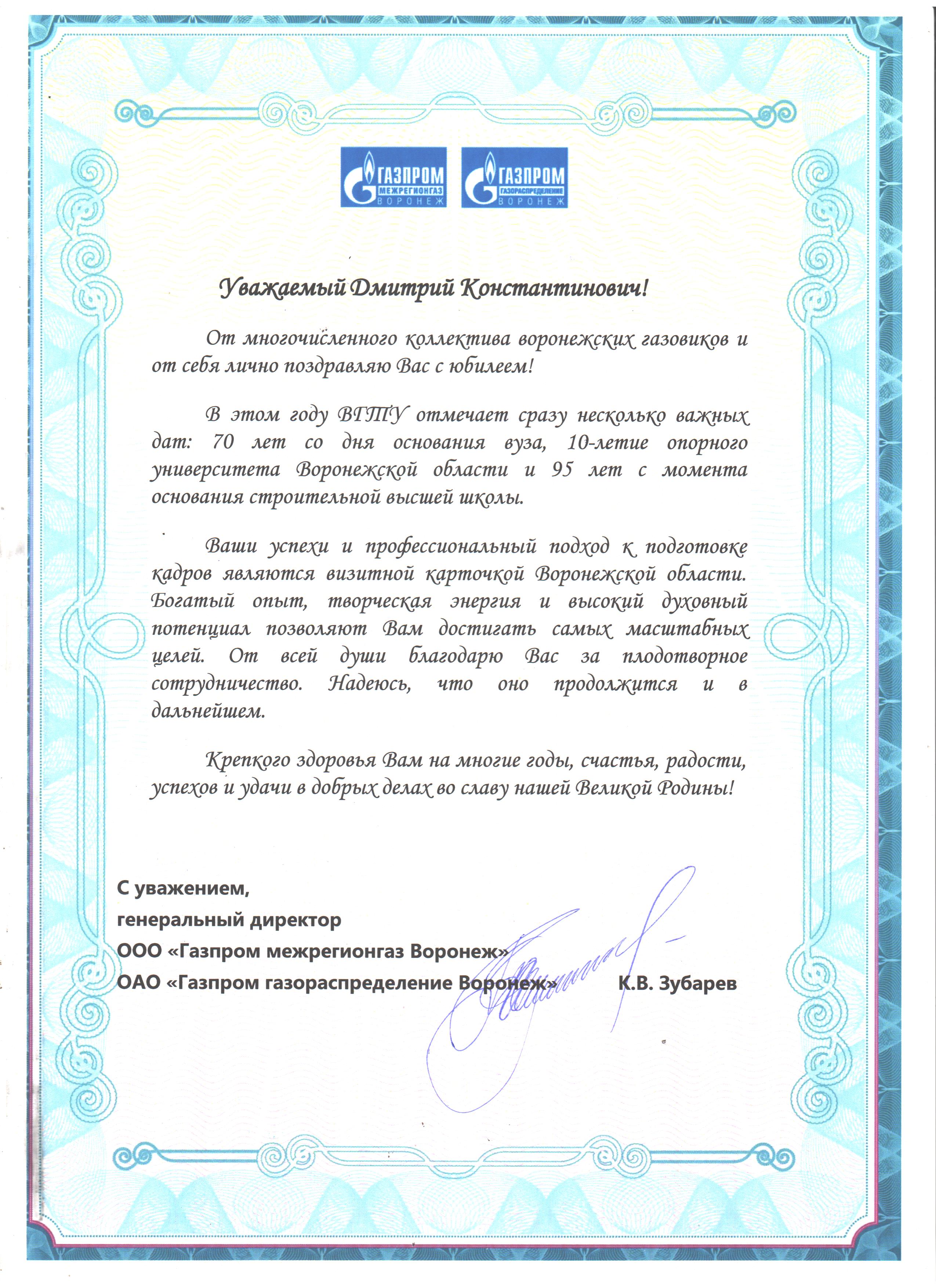 Поздравление от генерального директора ООО "Газпром межрегионгаз Воронеж" К.В. Зубарева