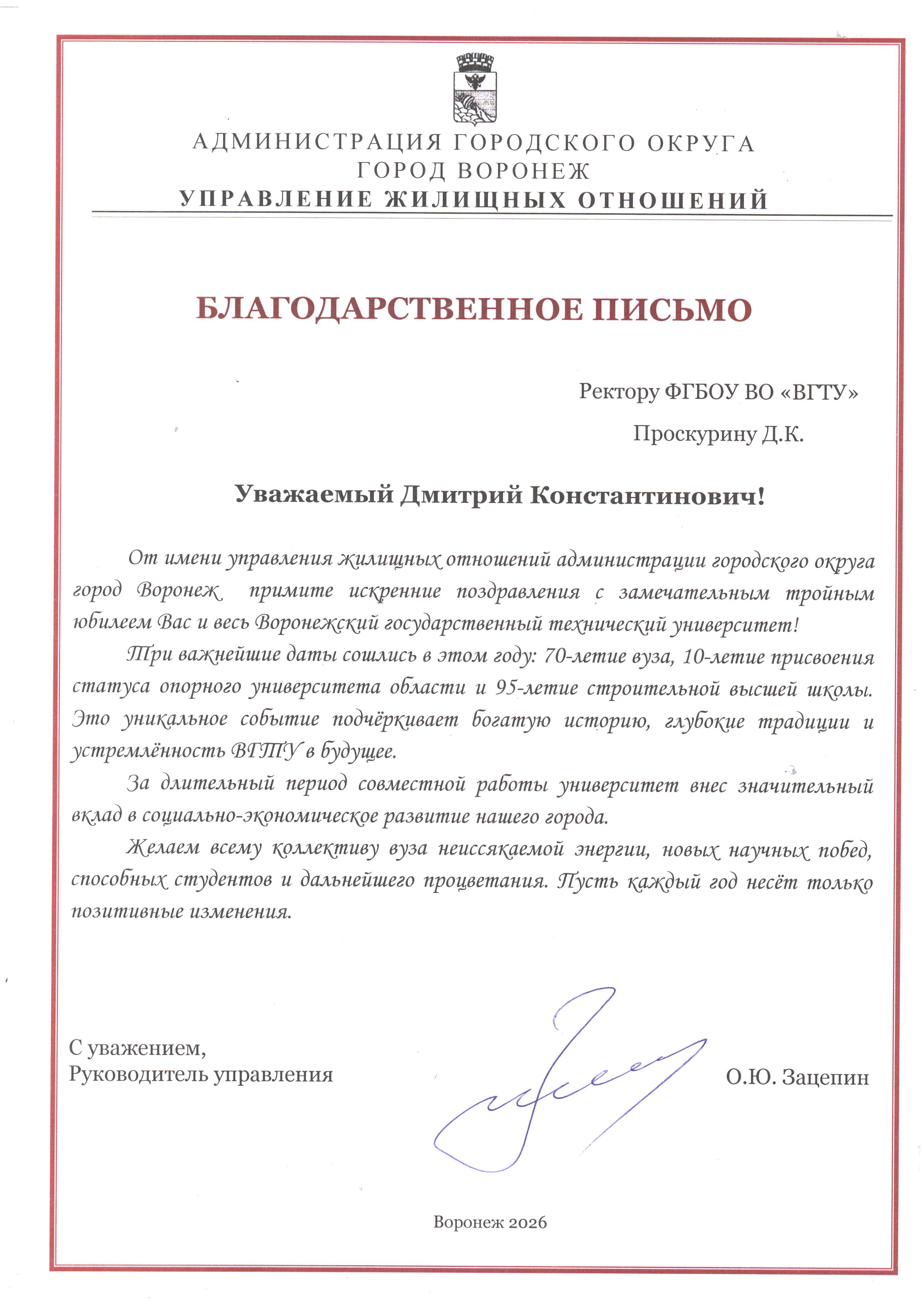 Поздравление руководителя управления жилищных отношений О.Ю.Зацепина